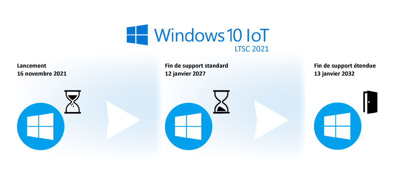 Selon la documentation officielle Microsoft, Windows 10 IoT Enterprise LTSC 2021, dernière version disponible, dispose d’un support standard jusqu’au 12 janvier 2027, puis d’un support étendu jusqu’au 13 janvier 2032.